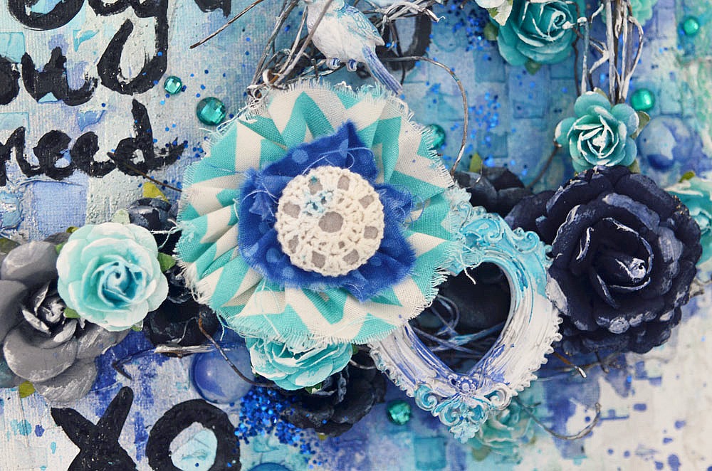 13. I have then added some more Shimmerz colour to the canvas. I sprayed the resin heart with the Vibez products and applied with a small paintbrush, some Shimmerz in Ultra Marine to underneath the embellishments to add more depth. The little resin bird also got a little colour added to him :)